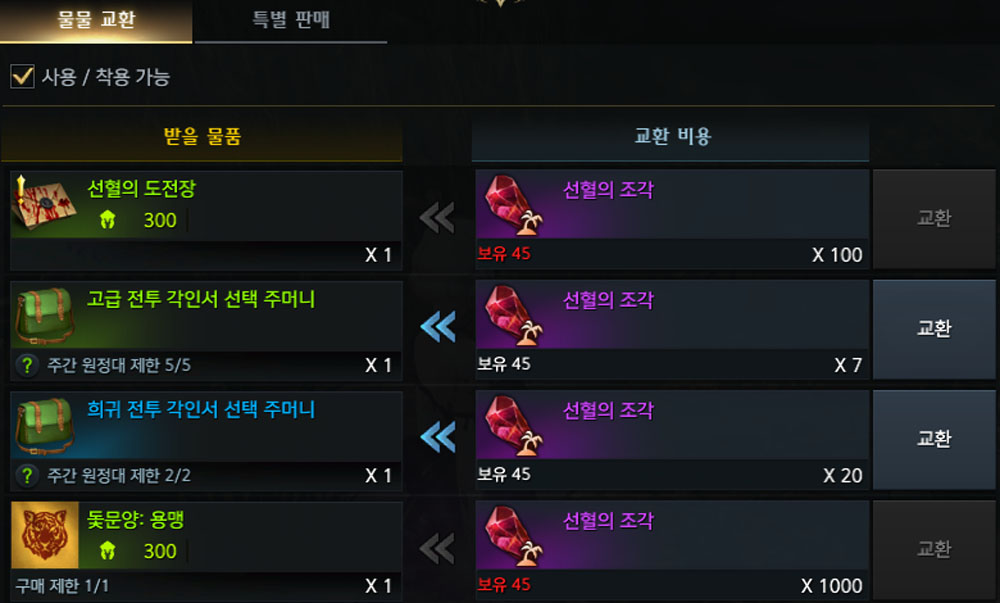설혈의 도전장은 물물교환을 통해 획득하실 수 있습니다. 특별 판매에는 "빛의 혈석", "어둠의 혈석" 이라는 아이템도 있는데 이건 사용 시 일정 시간 캐릭터 이팩트 효과만 부여되는 아이템 이라고 합니다.