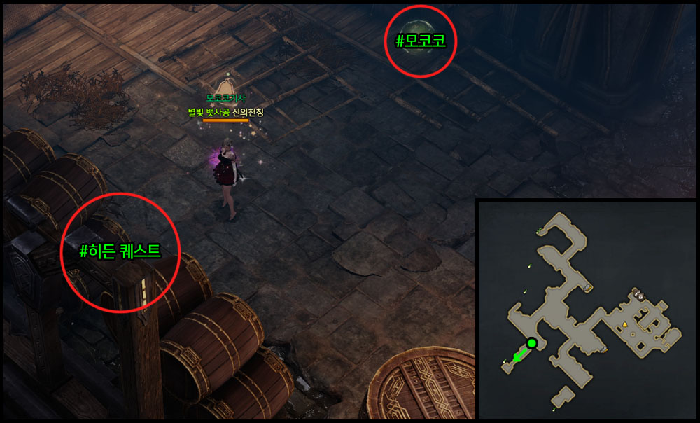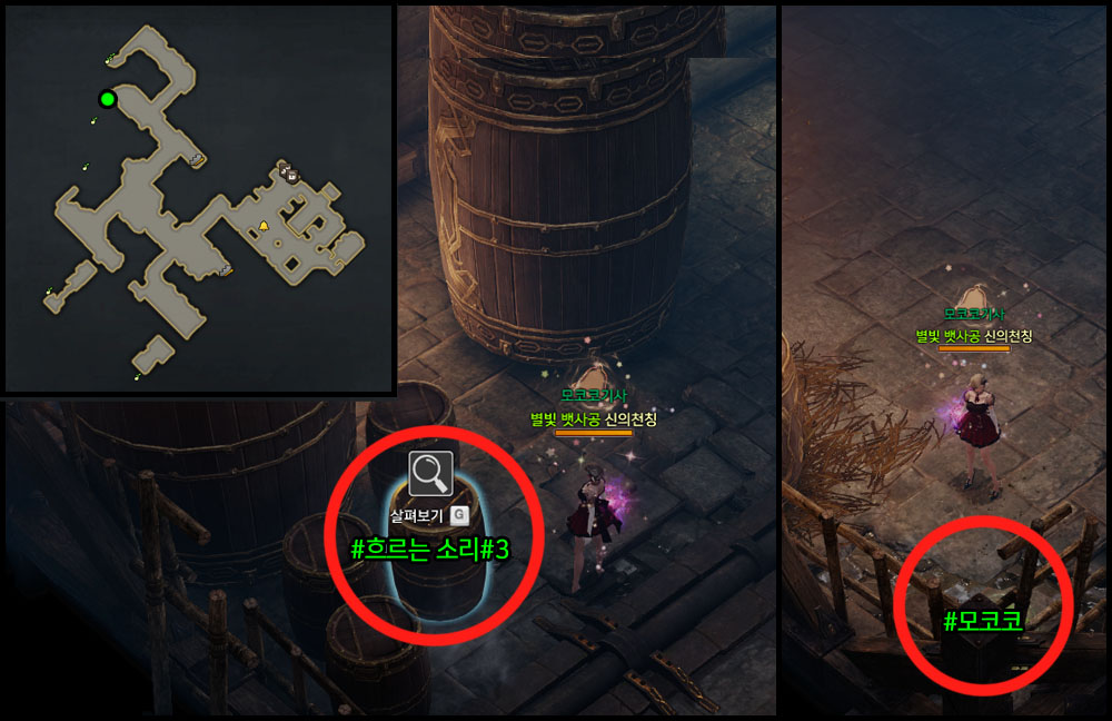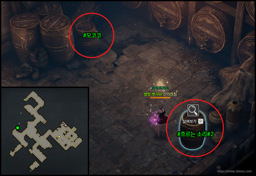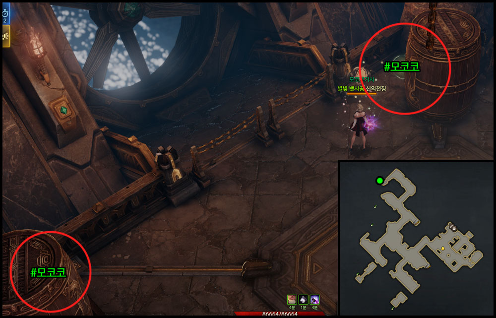 6번 위치로 이동하신 후 술통 상호작용을 통해 "흐르는 소리#2" 버프 획득과 모코코를 수집 합니다.
