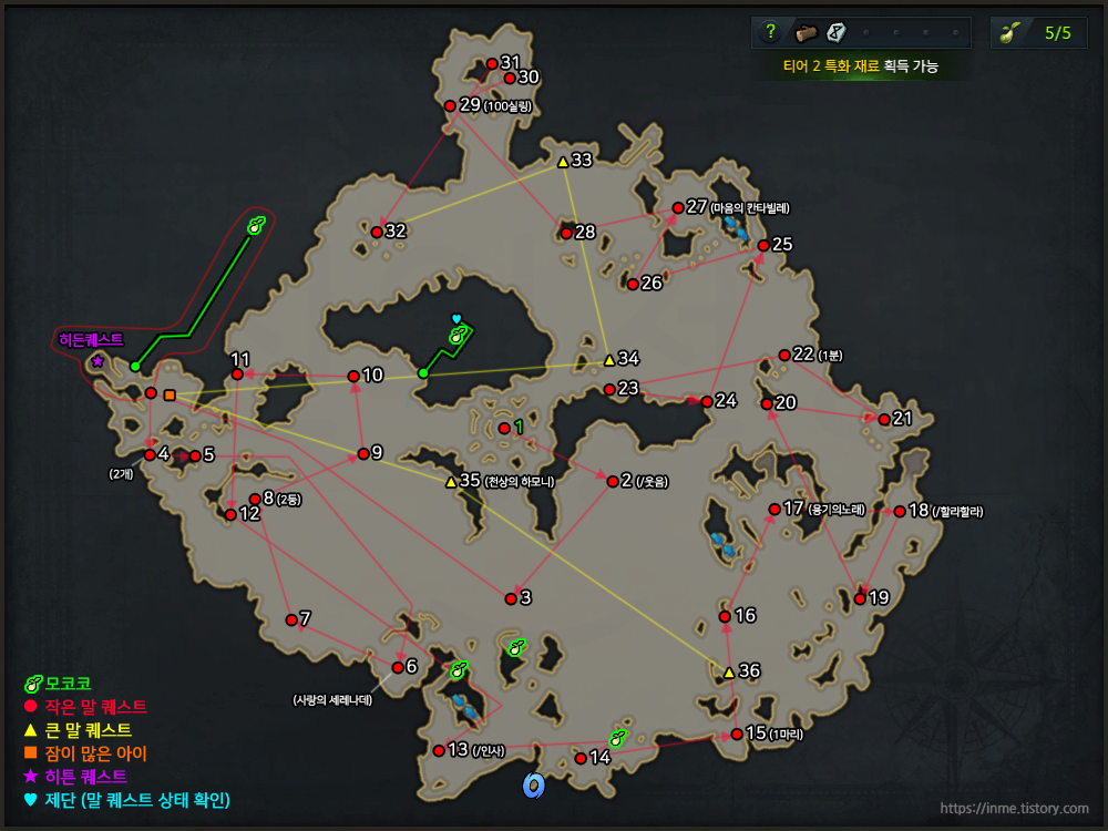 퀘스트 진행은 중앙에 있는 1번 위치 부터 시작을 하시면 됩니다. 등록된 번호 순서대로 따라가시면서 진행하시면 쉽게 클리어 하실 수 있습니다. 일부 이동하는 퀘스트가 있는 말이 있는 곳(4번, 14번)은 이동 전에 모코코 수집 또는 히든 퀘스틀르 완료하시는 것을 추천 드립니다.