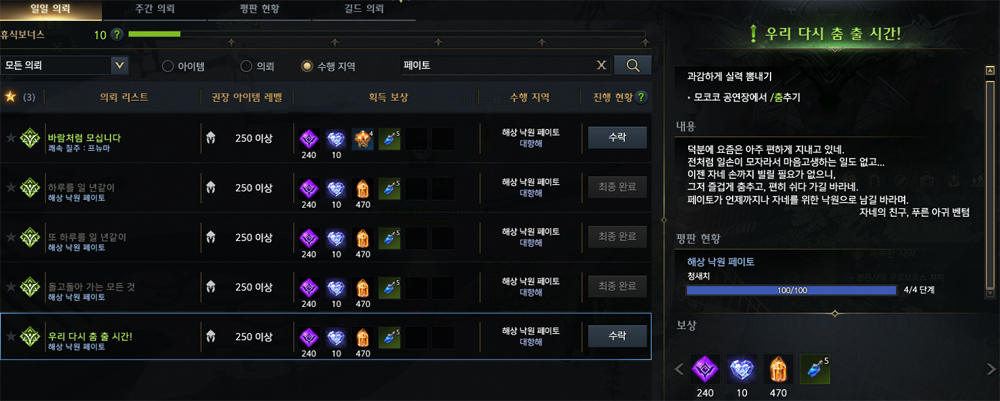 모든 평판 달성 후 보상을 위해 반복적으로 수행하면 좋은 에포나 입니다. 일반적으로 보조의 경우 실링 확보를 위한 로팡섬을 돌리는 경우가 있고 일부 골드 수급을 위해 어빌리티 스톤을 돌리는 경우도 있습니다.