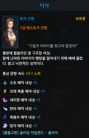 에스토크를 통해 항해를 하시는 분이라면 슬라임 아일랜드에서 획득해야 할 게 하나 더 있는데, 그건 바로 "선원 타샤" 입니다. 타샤의 경우 선박의 모든 내성을 올려줘 에스토크를 이용하는 유저라면 꼭 가지고 있어야 하는 선원입니다.