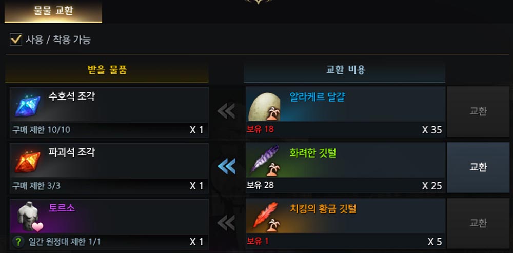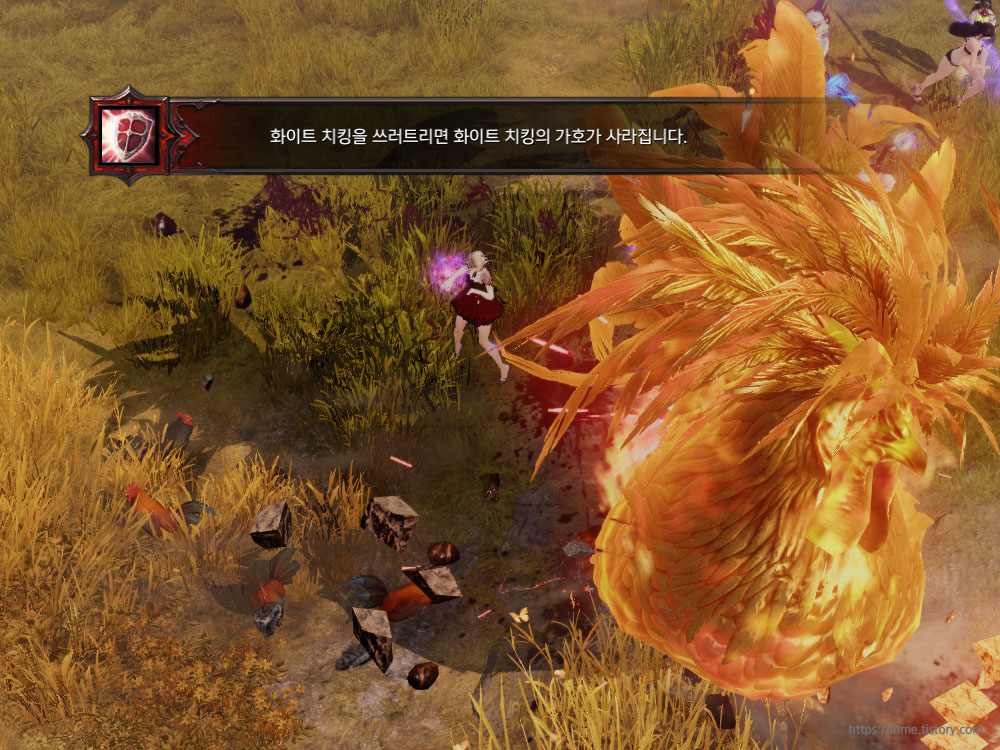 황금닭을 처치하기 전에 "화이트 치킹"과 "블랙 키칭"을 처치하는데 해당 닭을 처치하면 "치킹의 황금 깃털"을 드랍합니다. 해당 아이템은 오른쪽에 있는 NPC에게 토르소(영웅 호감도)로 교환이 가능하니 나가기 전에 교환하고 나가시기 바랍니다. (만약 나가버리셨다면 "아트로포스"에서도 교환이 가능합니다)