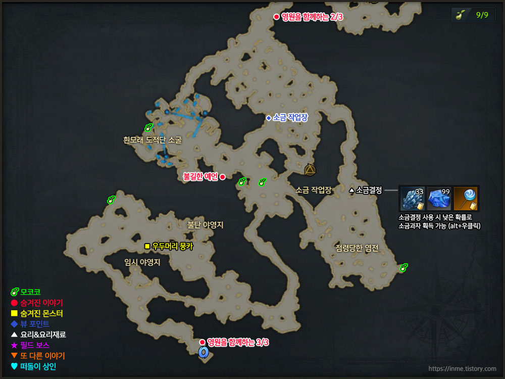 | 소금과자 | 살란드 구릉지 "소금결정" 수집 → 사용 시 랜덤하게 "소금과자" 획득 |