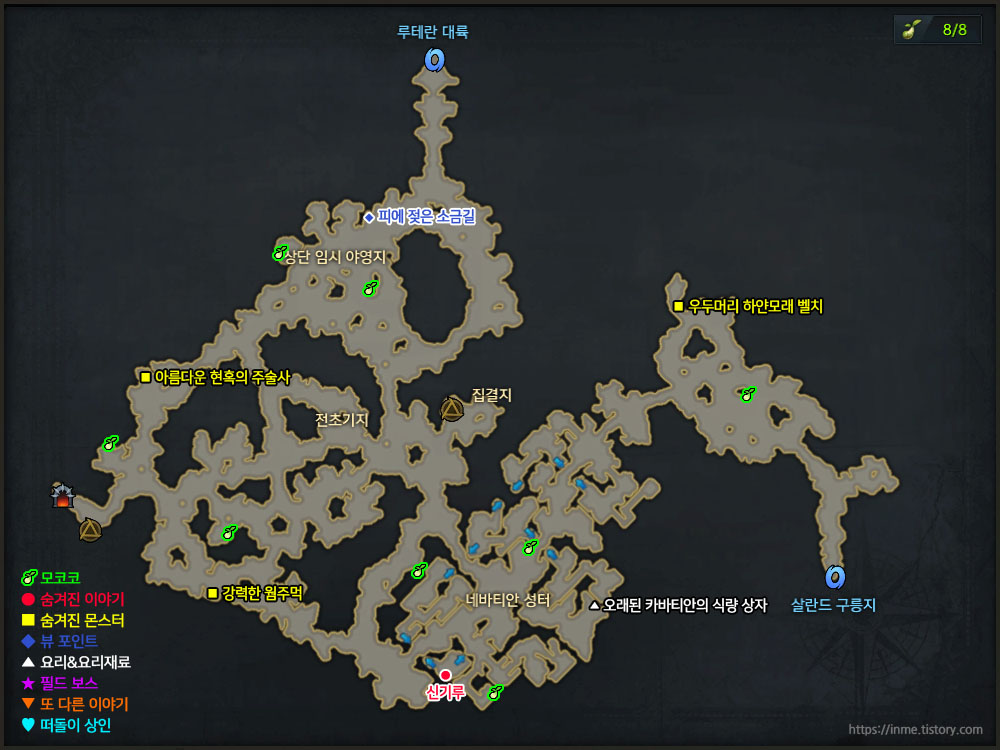 | 숨겨진 몬스터 | 소금거인 (필드보스) 나이든 소금 바위 거북 더러운 소금웜 우두머리 베티모스 날카로운 왈루 선인장 소금 사막 도적단 투사 단단한 소금벌레 |