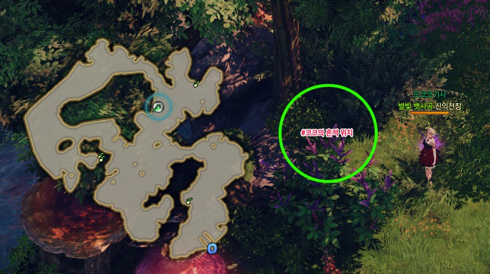 코코와 대화하기가 완료되면 "코코의 흔적"을 찾아오라고 합니다. 코코의 흔적은 나무 근처에 숨겨져 있습니다.